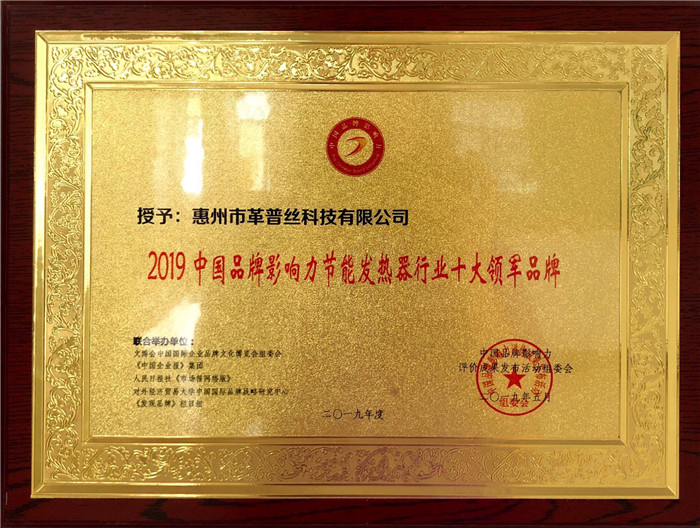 革普丝科技有限公司品牌榜上有名并荣获2019中国品牌影响力节能发热器行业十大领军品牌称号。