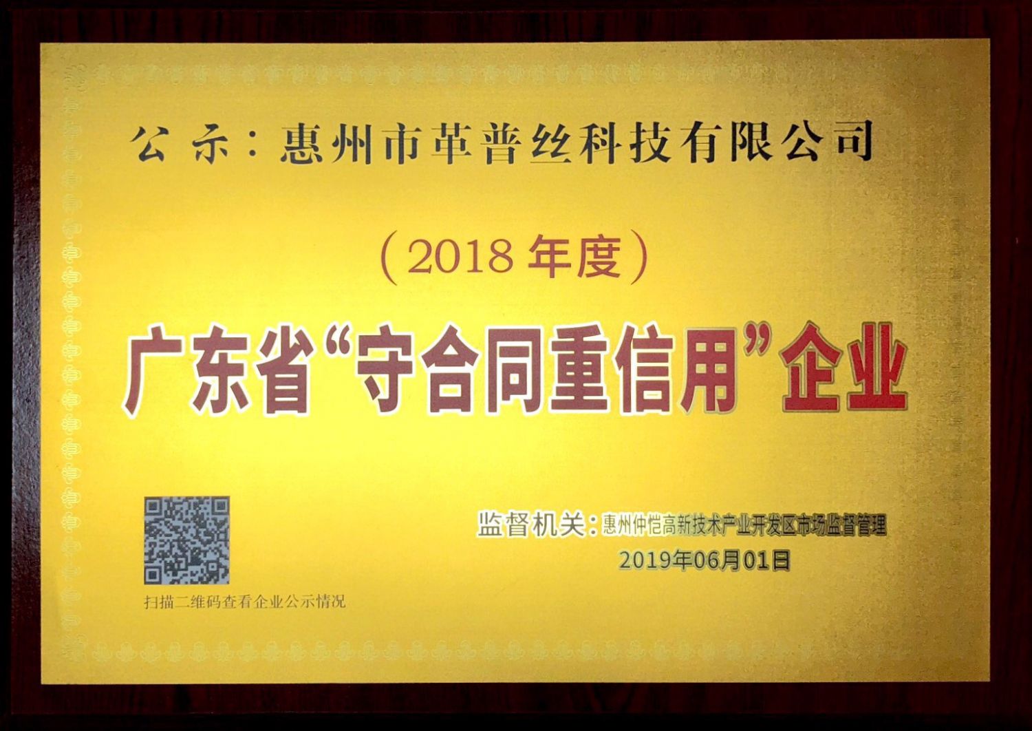 近日,经惠州市仲恺高新技术产业开发区市场监督管理局审核批准,惠州市革普丝科技有限公司获得“守合同重信用企业”荣誉证书。这是公司第二次获得该荣誉,公司凭借长期积累沉淀的强劲实力和始终如一的卓越服务,再次得到行业与社会的认可,专注、专业的形象深入人心。