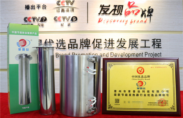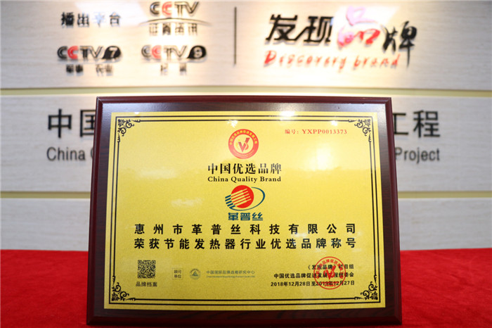 2018年12月,通过“优选品牌”工作人员实地走访考察,惠州市革普丝科技有限公司,成功被中国优选品牌促进发展工程选中,评选为“中国优选品牌”。CCTV证券资讯频道《发现品牌》栏目组携手中国优选品牌促进发展工程,授予其“节能发热器”行业优选品牌,以兹鼓励。